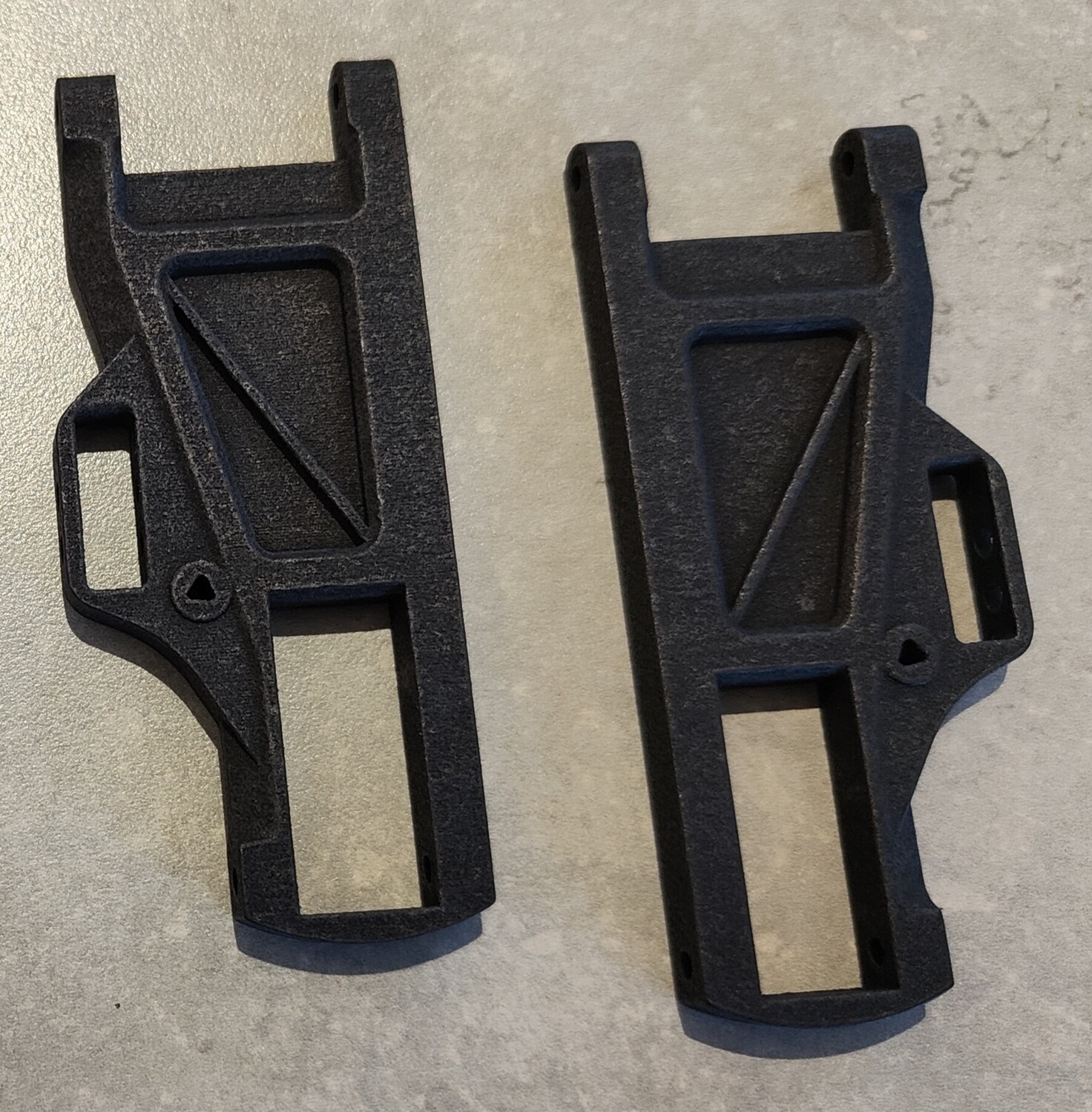 3D printed replacement front arms for the Yokomo Works 91-93. Hingepin holes are hand reamed to provide a better fit.